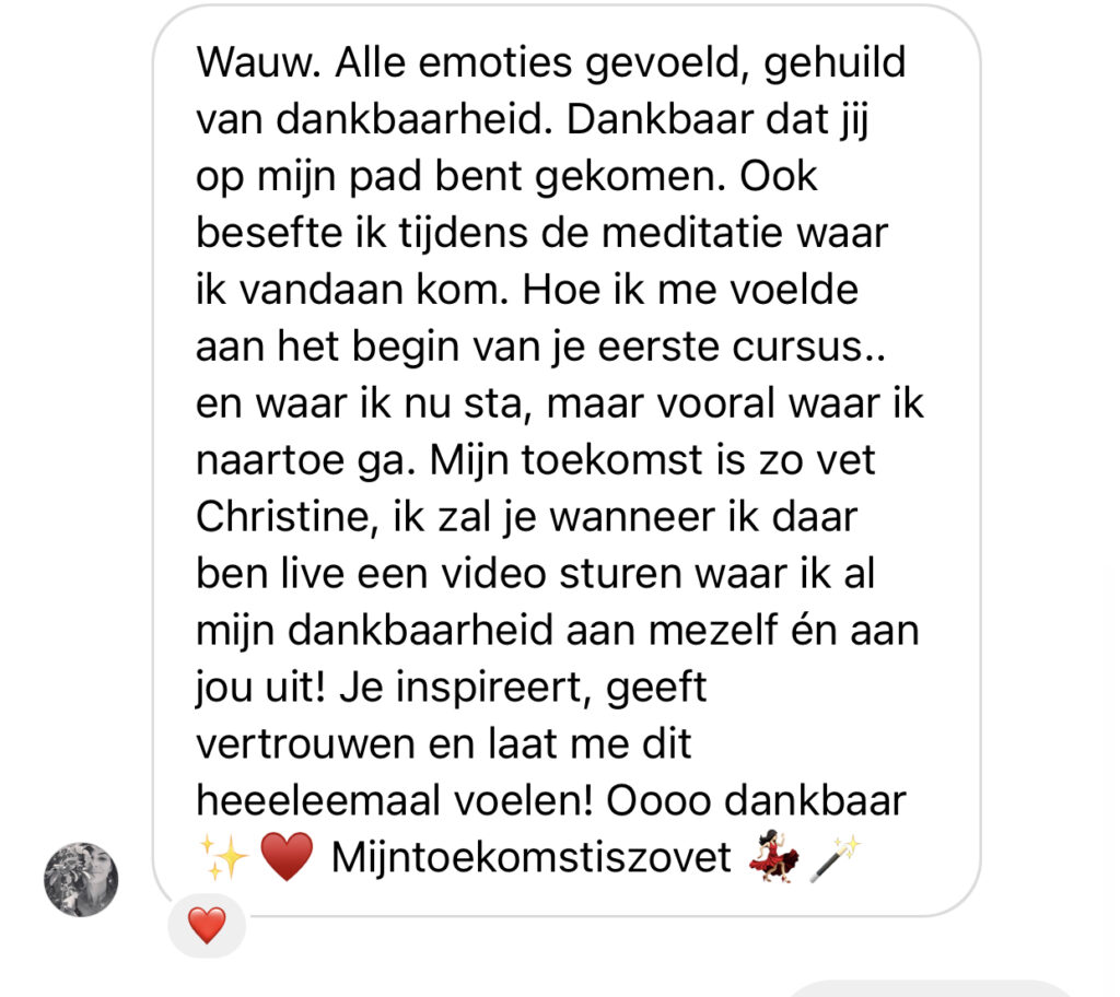 In 1,5 jaar tijd hebben 3000 mensen haar bekende Abundance en Intentions Insta cursussen gevolgd, heeft ze 50 mensen 1:1 gecoacht en zijn haar unieke meditaties 2000 keer gedownload.